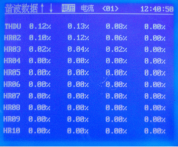 每页显示10次谐波数据,用“上翻”或“下翻”键进行翻页,可显示10~20次、21~30次、31~40次、41~50次谐波数据。